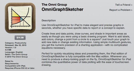 , a preto naň chce preniesť všetkých päť svojich hlavných produktov (na iPhone/iPod touch je dostupný iba jeden). Ak vám tieto aplikácie nie sú zatiaľ známe, jedná sa prevažne o programy, ktorých účelom je zvýšiť pracovnú produktivitu: task manager OmniFocus, softvér na tvorbu diagramov OmniGraffle, program na návrh štruktúry textu OmniOutliner, softvér na tvorbu grafov OmniGraphSketcher a program na manažovanie projektu OmniPlan. Aj keď nevieme, či bude od prvého dňa dostupných všetkých 5 aplikácii, z uniknutých screenshotov sa môžme uistiť aspoň o OmniGraphSketcher ($14,99/11,99 €) a OmniGraffle ($49,99/39,99 €).