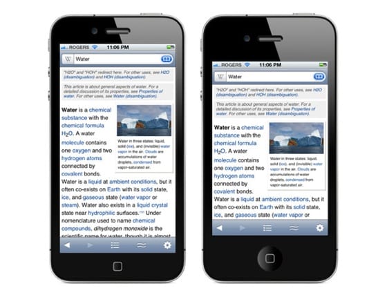 Wikipedia na imaginárnom iPhone so 4″ displejom (vľavo) a iPhone 4S (vpravo). Zdroj: overdrivedesign.com.