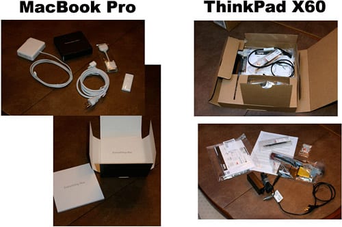 Pozrite sa konkrétne na porovnanie balenia notebookov MacBook Pro a IBM ThinkPad X60, ktoré spravil ZDnet a vlastne ma aj k článku inšpiroval: