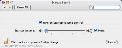 Našťastie je dostupná malá utilita StartupSound, pomocou ktorej môžete zvučku deaktivovať. Ondra Toral sa o nej zmienil vo svojom Podcaste č. 8.. Stiahnuť si ju môžete z VersionTracker-a. Po inštalácii sa zobrazí v System Preferences. Utilita funguje napriek svojmu veku aj v Mac OS X 10.4.x bez problémov.