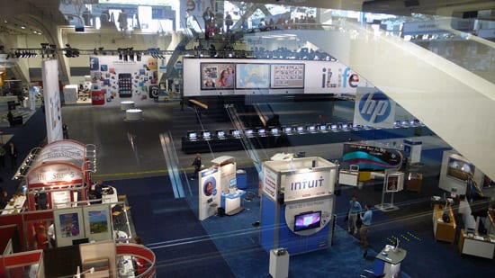 Pohľad na stánok Apple v južnej hale ešte pred otvorením výstavy (cez sklo z galérie).