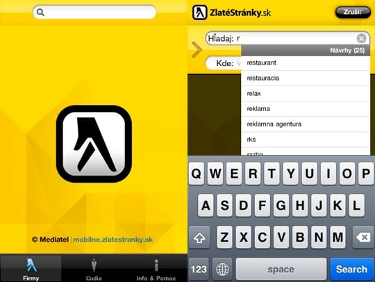 Aplikácia Zlaté Stránky je zadarmo dostupná cez App Store. K dispozícii je nielen slovenská, ale aj česká verzia. Kompatibilné sú s iPhonom (OS 3.0 a novšie) a iPodom touch 2. generácie.