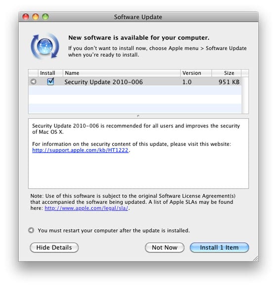 Apple sprístupnil prostredníctvom Software Update novú bezpečnostnú aktualizáciu pre Mac OS X, Security Update 2010–006, určenú pre Mac OS X 10.6.4. Zatiaľ čo popis zobrazený v Software Update neobsahuje žiadne podrobnosti okrem toho, že aktualizácia zlepšuje bezpečnosť systému, oficiálne stránky venované tejto aktualizácii hovoria o vyriešení problému, vďaka ktorému sa útočník so znalosťou používateľského mena mohol pripojiť na počítače využívajúce zdieľanie priečinkov aj bez hesla. Zdieľanie priečinkov je štandardne vypnuté a problém sa netýka systémov pred Mac OS X 10.6. Aktualizáciu stiahnete cez Software Update alebo tu, jej inštalácia vyžaduje reštart počítača.