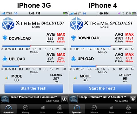 iPhone 4 je oproti iPhonu 3G výrazne rýchlejší aj v sťahovaní a odosielaní dát. Dokazuje to testovanie redaktora stránok ZDnet, ktorý porovnával iPhone 3G a iPhone 4 prostredníctvom testov rýchlosti na stránkach Speedtest.net a v aplikácii Speedtest od Xtreme Labs.
