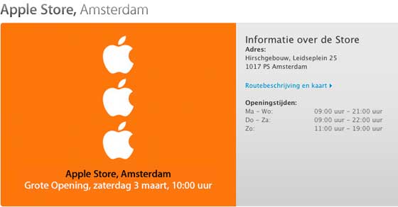 Centrum Amsterdamu je už týždeň ožiarené výraznými národnými farbami pripravovaného Apple Storu. Doposiaľ sa však len špekulovalo o tom, kedy má byť tento prvý holandský Apple Store otvorený. Apple napokon potvrdil, že k veľkému otvoreniu dôjde 3. marca o 10:00. Novinárom bude predajňa ukázaná už o dva dni skôr. Vďaka tomuto obchodu bude Holandsko 12. krajinou, do ktorej sa dostal oficiálny Apple Store. Nový obchod má už aj svoje oficiálne stránky.