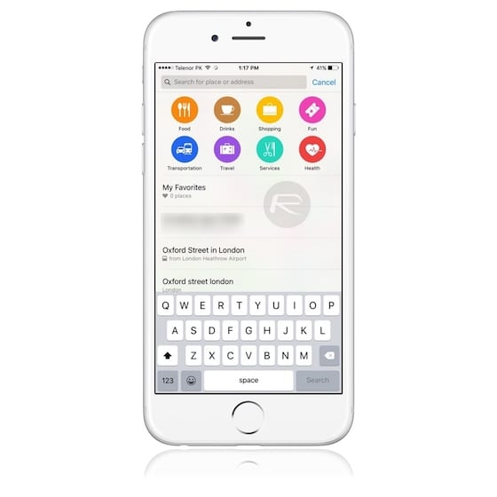 Rýchle návrhy v Mapách: kliknutím na vyhľadávacie pole v aplikácii Mapy sa zobrazia návrhy pre jedlo, pitie, nakupovanie … .