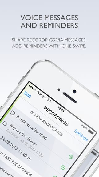 Zachyťte svoje myšlienky krátkym zvukovým záznamom cez aplikáciu Say&Go Memo Recorder. Aplikácia umožňuje nahrávať 4 až 75 sekundové krátke záznamy, ktoré môžete dopĺňať o pripomienky. Nahrávky je možné automaticky zdieľať cez DropBox, Evernote a e-mail. Aplikácia je k dispozícii aj pre Apple Watch.
