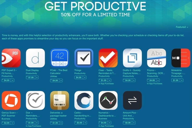 Apple tento týždeň v rámci promo akcie ponúka vybrané iOS aplikácie zamerané na zlepšenie produktivity za polovičnú cenu. Medzi nimi nájdeme napríklad to-do appky ako Clear a Things, editor PDF Expert 5, manažér hesiel 1Password, či utilitu Duet Display.