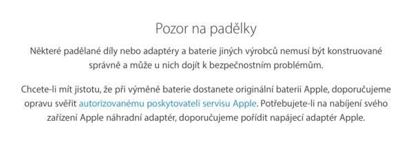 Chcete-li mít jistotu, že při výměně baterie dostanete originální baterii Apple, doporučujeme opravu svěřit autorizovanému poskytovateli servisu Apple. Potřebujete-li na nabíjení svého zařízení Apple náhradní adaptér, doporučujeme pořídit napájecí adaptér Apple.