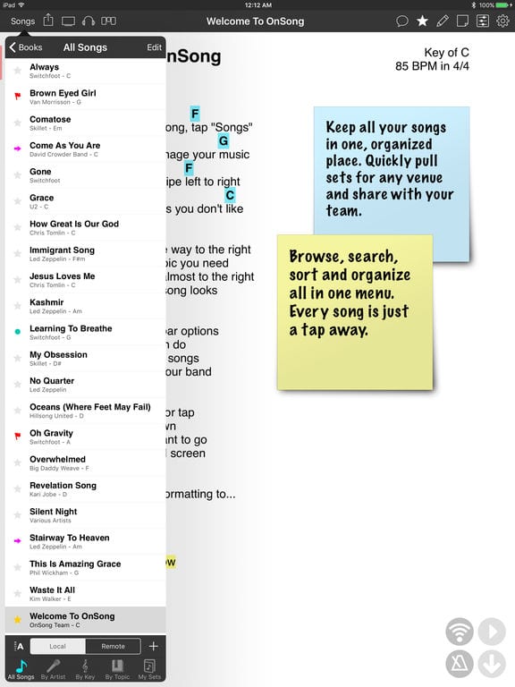 Aplikácia OnSong je určená pre hudobníkov. Umožňuje organizovať zbierky textov a akordov.