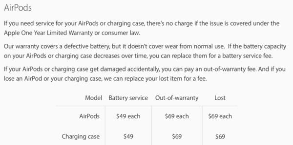Na stránkách Apple podpory v USA se můžeme dočíst spoustu informací. Například že pokud zničíte nebo ztratíte jedno ze sluchátek EarPods nebo dokonce nabíjecí pouzdro, za náhradní kus zaplatíte 69$.