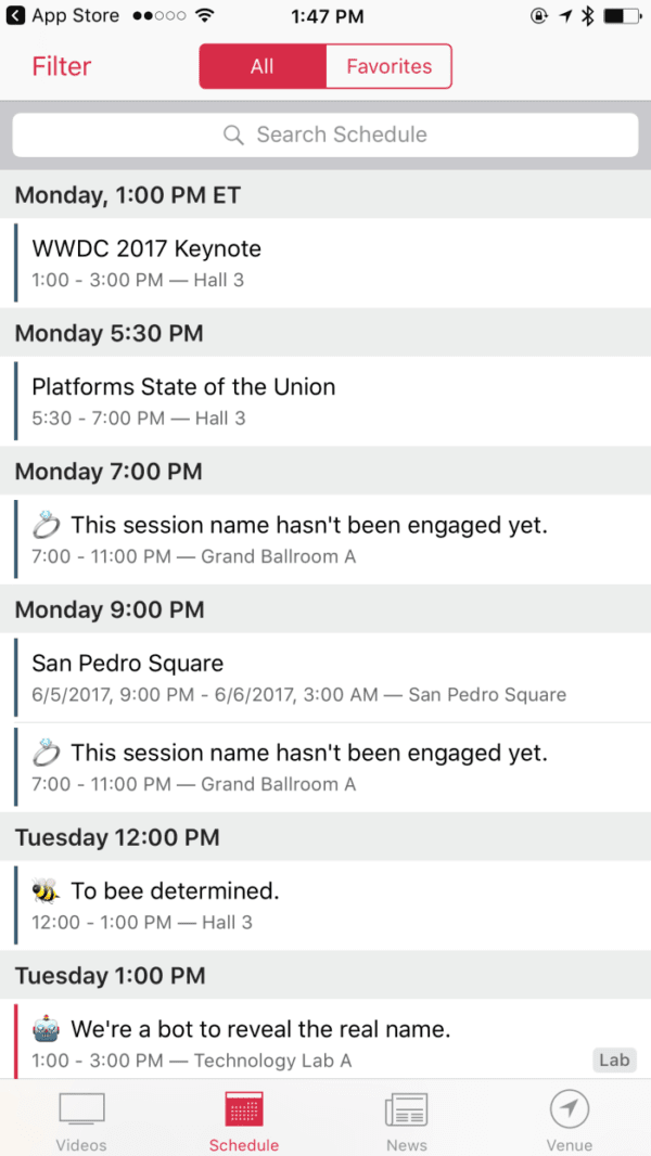 Vývojáři každým rokem používají tuto aplikaci k tomu, aby byli vždy v obraze o aktuálním dění na WWDC. V aplikaci si účastníci dále mohou zobrazit časový plán akce a informace o místě. Aplikace nově mimo jiné obsahuje i playlisty videí a interaktivní mapy.