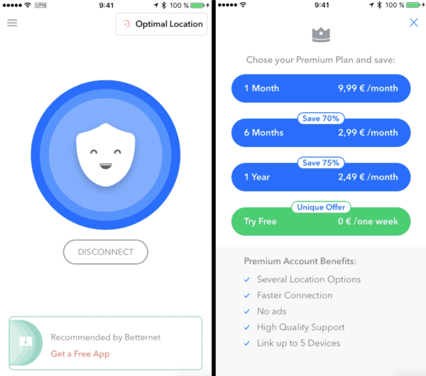Pro obrovské množství lidí, kteří se bojí o své soukromí opravdu velmi uživatelná aplikace. Hodí se také pro ty, kteří často používají free veřejné sítě. Ty jsou často minimálně zabezpečené a hackeři by se do nich mohli nabourat a sledovat jakýkoliv internetový přenos. Aplikace se mimo jiné dá použít třeba na školní wi-fi sítě na kterých je zakázáno procházení určitých webů. Po aktivaci VPN totiž weby začnou fungovat. Aplikace je sice v základu zdarma, ale pro její prémiové funkce, které vřele doporučuji, si musíte připlatit. Jsou nabízené různé cenové tarify – měsíční, půlroční a roční. Měsíční předplatné stojí 9,99$. Na zbývající 2 předplatné jsou v době psaní článku slevy až 75%. Zakoupením získáte například rychlejší připojení, odstranění reklam a možnost vybrat si místo, kam se připojujete.