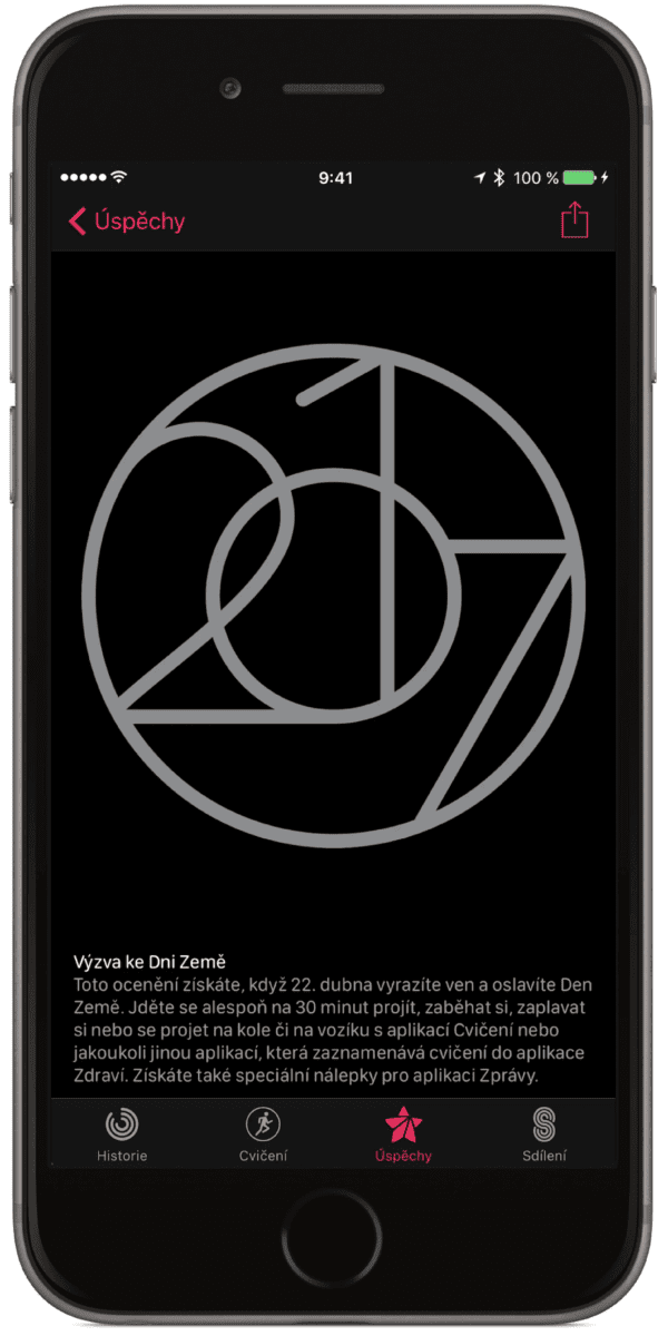 Jděte ven a oslavujte Den Země 22. dubna a získejte tak tuto odměnu. Jdětě na procházku, proběhněte se, jděte na kolo nebo se projeďte na vozíku na dobu alespoň 30 minut nebo více a zaznamenejte toto cvičení v aplikaci Cvičení. Pokud máte Apple Watch Series 2, pak můžete zaznamenat jako cvičení i plavání. Pro záznam cvičení můžete použít i jakoukoliv aplikaci třetí strany, která zapisuje vaše výkony do aplikace Zdraví. Jako odměnu dostanete odznak a také speciální samolepky do iMessage.