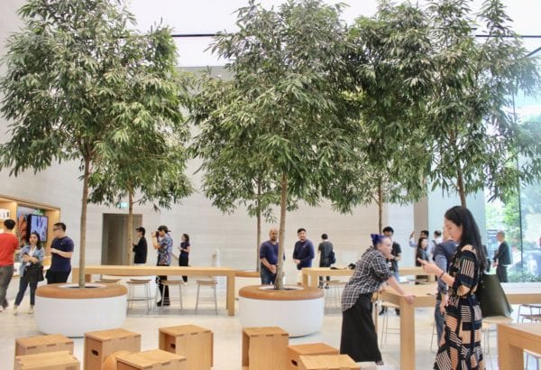 Ten je veľmi podobný ostatným vlajkovým predajniam novej generácie. Budova disponuje 36 metrovou sklenenou fasádou, pod ktorou nájdeme dve poschodia. Na tom prvom sa nachádzajú klasické stoly s celým portfóliom vystavených produktov, zatiaľ čo vyššie nájdeme veľký priestor plný stromov importovaných z Malajzie. Poschodia spája masívne točité schodisko inšpirované dizajnom v Apple Parku, sídle spoločnosti.