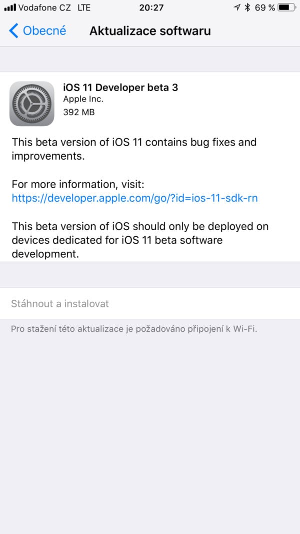 iOS 11 beta 3 je právě dostupná pouze registrovaným vývojářům se zaplaceným vývojářským účtem. Veřejná beta verze bývá většinou vypuštěna do několika dnů po vydání vývojářské bety. To proto, aby vývojáři zjistili, zda-li nová verze nemá nějaké významné chyby, které by mohly ohrožovat veřejné testery. Tito registrovaní vývojáři mohou stahovat novou betu přímo v testovacím zařízení a to v Nastavení -> Obecné -> Aktualizace softwaru. Je však nutné mít nainstalovaný příslušný vývojářský profil. Druho možností jak betu nainstalovat je pomocí Apple Developer Centra (developer.apple.com).