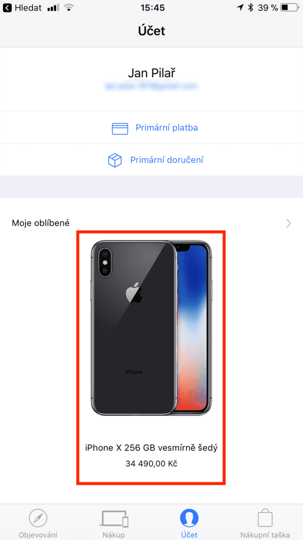- Ve spodní liště otevřete záložku „Účet“ a zde uvidíte už předem Vámi nakonfigurovaný iPhone X v sekci „Moje oblíbené“