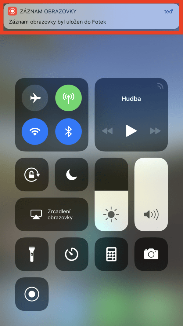 - Pro zpětné vypnutí nahrávání můžete zpátky vysunout ovládací centrum a znovu stisknout tlačítko nahrávání, nebo klepnout na červený řádek, který by se měl ukazovat u horní hrany displeje.
