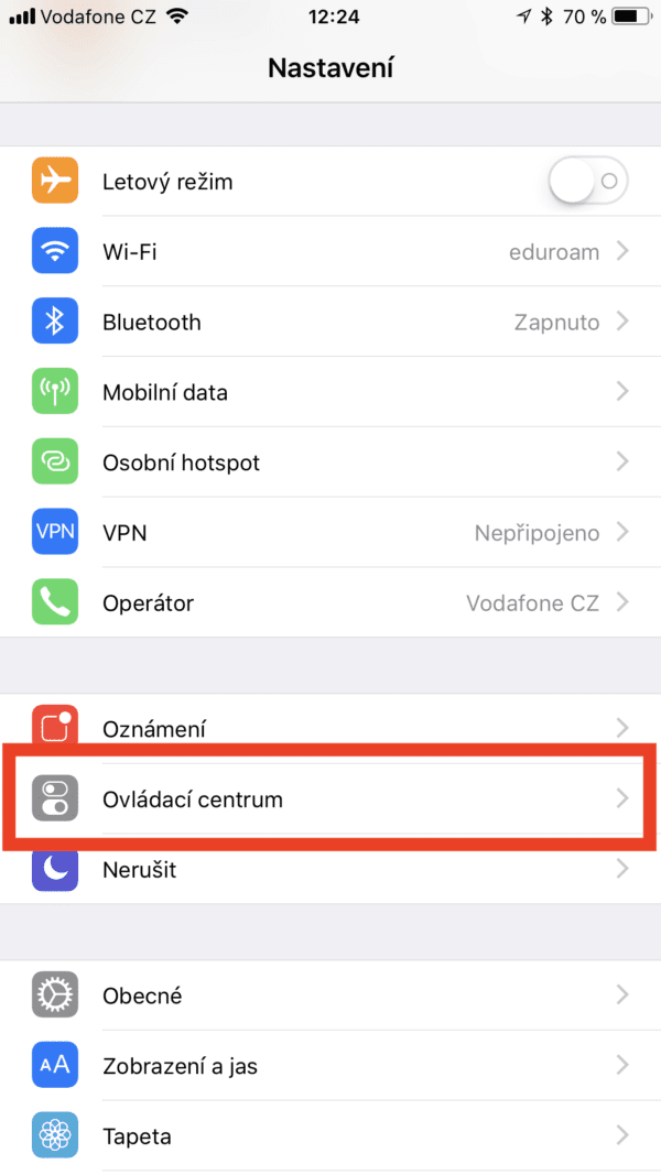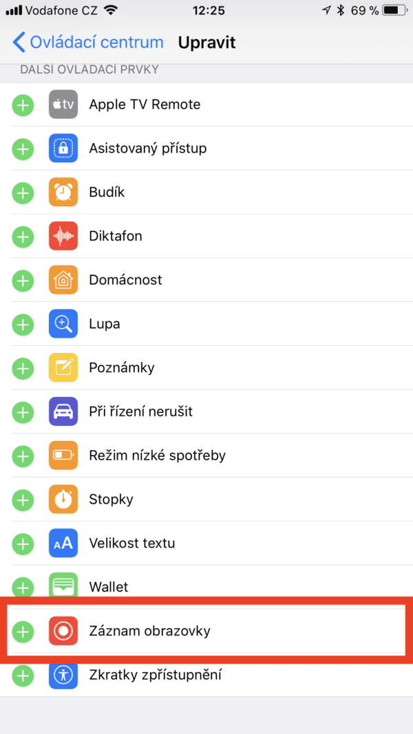 - Najděte položku „Záznam obrazovky“ a klepněte na zelené tlačítko „⊕“.