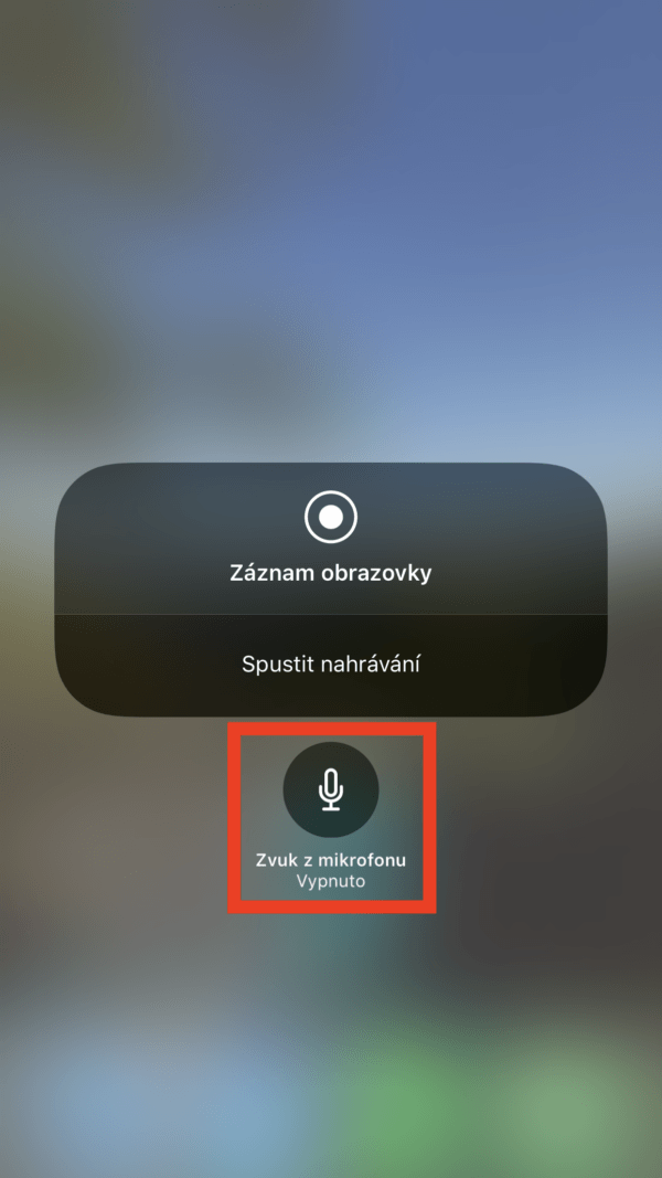 - Pokud na tlačítko použijete 3D Touch, objeví se vám nabídka, ve které je možné zvolit používání mikrofonu. Pokud je pod kulatým tlačítkem napsáno „Vypnuto„, pak bude telefon nahrávat spolu s obrazovkou pouze zvuky telefonu. Jako příklad můžeme použít třeba hraní nějaké hry. V případě, že je u mikrofonu napsáno „Vypnuto„, pak budou (kromě obrazovky) nahrávány pouze zvuky ze hry. V případě že je u mikrofonu napsáno „Zapnuto„, bude ke zvukům hry přidán ještě Váš komentář při hraní hry a také okolní zvuky.
