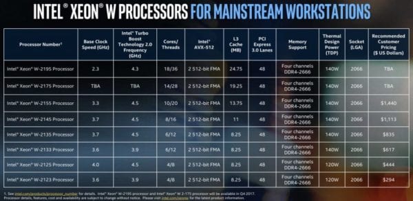 Nové čipy, které využívají LGA2066 socket a Skylake-SP architekturu, budou dostupné v několika verzích, které se budou lišit počtem jader. Možné bude zakoupit procesor s 8mi, 10ti nebo 18ti jádry. Všechny procesory budou mít Turbo Boost až do 4,5 GHz a 48 PCI Express 3.0 linek. Jako paměť k tomuto procesoru bude možné použít až 512 GB DDR4 RAM o taktu 2666 MHz.
