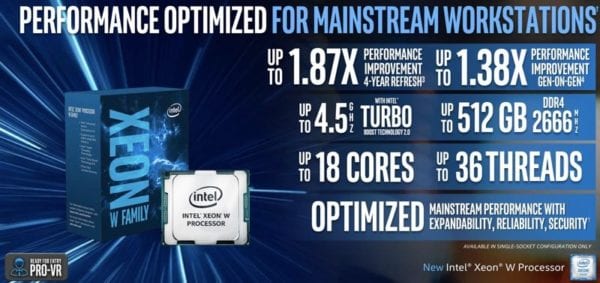 Podle Intelu by měly Xeon-W čipy nabídnout 1,87x větší výkon v porovnání s 4 roky starou pracovní stanicí s procesorem Intel Xeon E5-1680 v2 Romley. To je v podstatě stejná pracovní stanice jako 8-jádrový Mac Pro z roku 2013. Oproti loňskému procesoru (Xeon E5-1680 v4) je ten letošní 1,38x výkonnější.