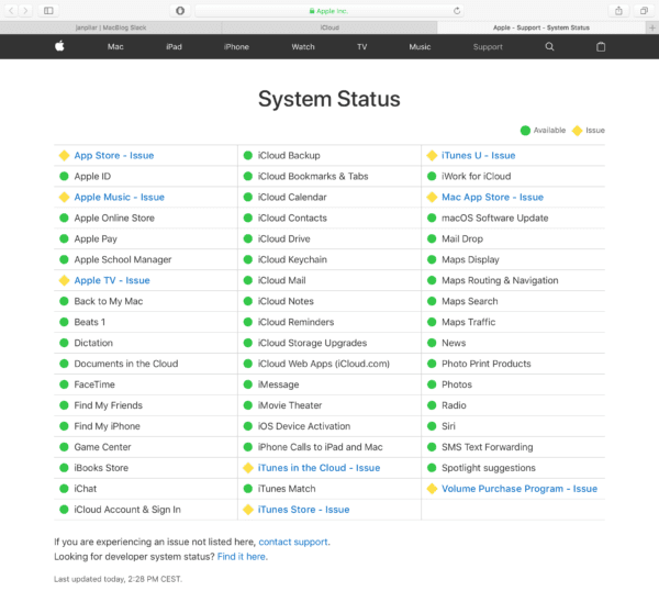 Na statusové stránce serverů Applu se v současnou chvíli ukazují výpadky některých služeb. V době psaní článku se ukazuje, že přerušovanými výpadky postužující některé uživatele trpí tyto služby: