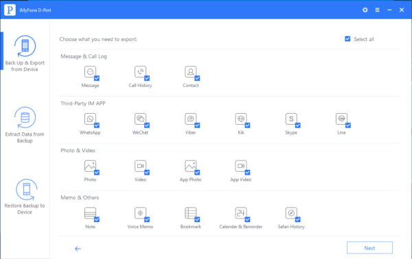 iMyFone D-Port je profesionálny exportér a zálohovací nástroj pre iOS. Zbavuje vás Apple obmedzenia týkajúceho sa zálohovania alebo exportovania údajov z vašich zariadení so systémom iOS do počítača. Môžete ho použiť na zálohovanie alebo export všetkých dát a nastavení na zariadeniach iPhone, iPad a iPod touch. Nové zálohy neprepíšu predchádzajúce zálohy. Okrem toho ho môžete použiť na selektívne zálohovanie alebo exportovanie iba požadovaných údajov, ako sú správy WhatsApp / Kik / Viber, poznámky, hlasové poznámky, záložky Safari, iMessages, textové správy, kontakty atď.