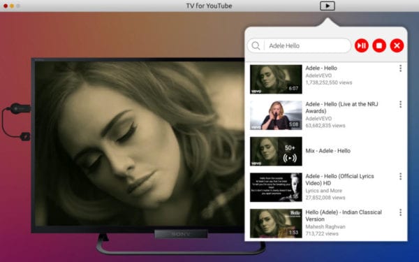 Aplikácia TV for YouTube umožňuje prehrávať videá z YouTube bez nutnosti otvoriť internetový prehliadač, stačí len kliknúť na ikonu aplikácie v menu bare. Ak máte pripojený váš smart televízor na rovnakej sieti ako počítač Mac, môžete si priamo v aplikácii vybrať na ktorom zariadení sa má video prehrávať.