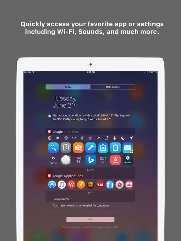 Widgety zobrazujú informácie z vašich obľúbených aplikácií. Svoje widgety nájdete v zobrazení Dnes. Stačí potiahnuť prstom doprava cez plochu, zamknutú plochu alebo centrum hlásení. Aplikácia Magic Launcher Pro je výkonný nástroj, ktorý vám prináša množstvo plne konfigurovateľných widgetov, v ktorých si môžete upraviť veľkosť a tvar ikon, text, či pozadie. Aplikácia ponúka aj správu nastavení ako rýchle zapnutie / vypnutie Wi-Fi, 3G, Bluetooth, GPS …