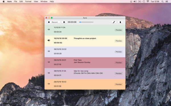 Aura je jednoduchý diktafón pre váš Mac. Aplikácia vaše nahrávky farebne rozlíši a môžete si ich neskôr exportovať.