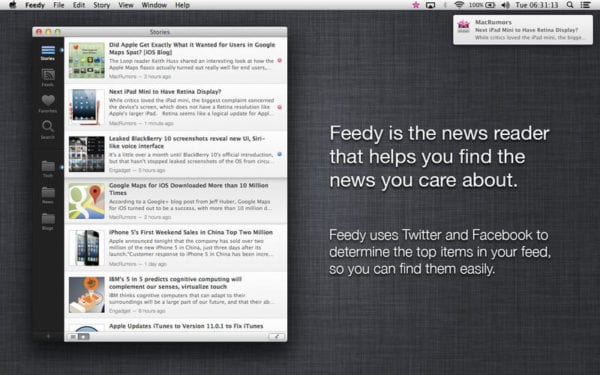 Feedy je elegantná RSS čítačka pre váš Mac. Jednoduché rozhranie vám umožňuje mať prehľad o všetkých novinkách z vašich obľúbených webových stránok.