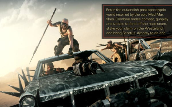 Hra Mad Max prináša otvorený svet v post-apokalyptickom svete, kde jedinou šancou na prežitie sú autá. Hráči prevezmú úlohu Mad Maxa, osamelého bojovníka, ktorý musí bojovať o prežitie s divokými gangmi banditov. Pretože Maxovi ukradnú jeho ikonické auto Interceptor, Max sa musí dať dohromady s talentovaným, ale podivným mechanikom Chumbucketom a ďalšími, aby zostavil špeciálne vojenské vozidlo a pomocou neho utiekol z Pustiny.