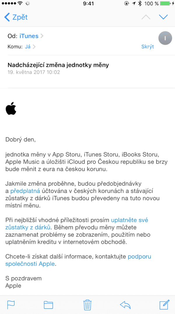 Tato změna platební jednotky byla ze strany Applu avizována už před několika dny pomocí mailu, který naleznete níže. Změna platební jednotky se týká ČR, Polska, Rumunska, Bulharska, Maďarska a Chorvatska. To jsou však pouze státy v Evropě. Dostalo se však i na státy mimo Evropu. Nově pomocí tamní měny zaplatí třeba na App Store občané Chile, Kolumbie a Peru.