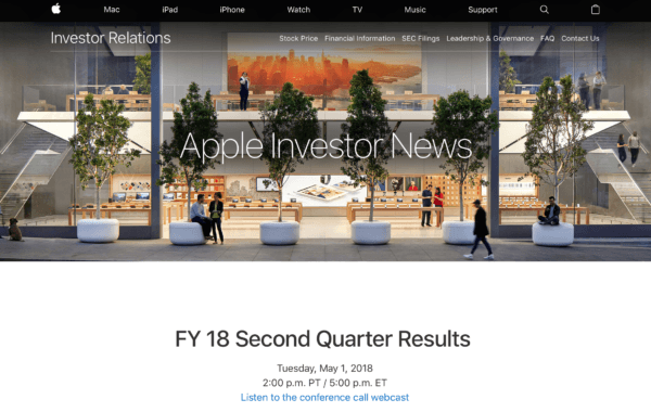 Apple před pár dny aktualizoval svou stránku, která je určena především pro investory do společnosti. Na stránce se objevila nová informace o zveřejnění hospodářských výsledků za druhý fiskální (první kalendářní) kvartál roku 2018. Ke zveřejnění dojde 1. května 2018.