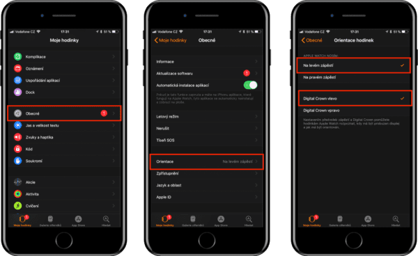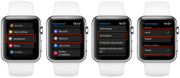 Pokud nosíte vaše jablečné hodinky v defaultním nastavení, měly by být zaškrtnuty možnosti „Na levém zápěstí“ a „Digital Crown vpravo„. Pokud chcete změnit orientaci vašich hodinek, tak vyberte možnost „Digital Crown vlevo„. Samozřejmě tato nastavení platí pokud hodinky nosíte na vaší levé ruce. Displej vašich Apple Watch se poté okamžitě otočí o 180 stupňů.