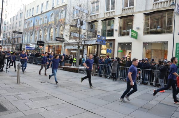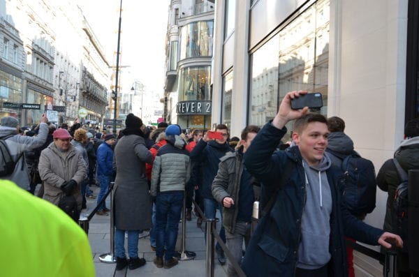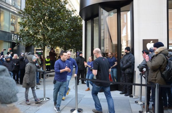 Návštevník Apple Store: Tak z videí na internete som zistil, že sa nejedná iba o obyčajné otvorenie, ale že Apple z toho spravil akúsi ceremóniu. No to, že budeme stáť takto v radoch, a že nás budú usmerňovať, dokonca že budú zamestnanci vybiehať z predajne, to som ozaj nečakal.