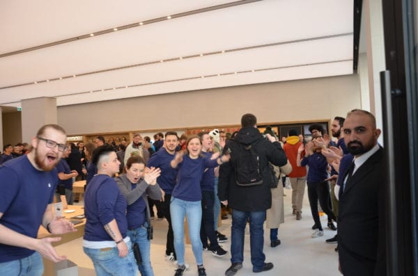 Postavili sme sa teda do radu a nie príliš veľkou rýchlosťou sme sa posúvali pomaly vpred. Vždy keď sme prešli z jednej rady do druhej, dostali sme kartu s číslom, aby sme sa nepredbiehali. Medzitým vybiehali z predajne zamestnanci Apple a zdravili ľudí behom a krikom aby ukázali svoje nadšenie z otvorenia novej predajne, nadšenie zo zákazníkov, ktorí prišli a taktiež svoju zapálenosť pre vec. Zdravili sa s ľuďmi čakajúcimi v rade a následne vbehli späť do predajne, kde dokončili posledné úpravy.