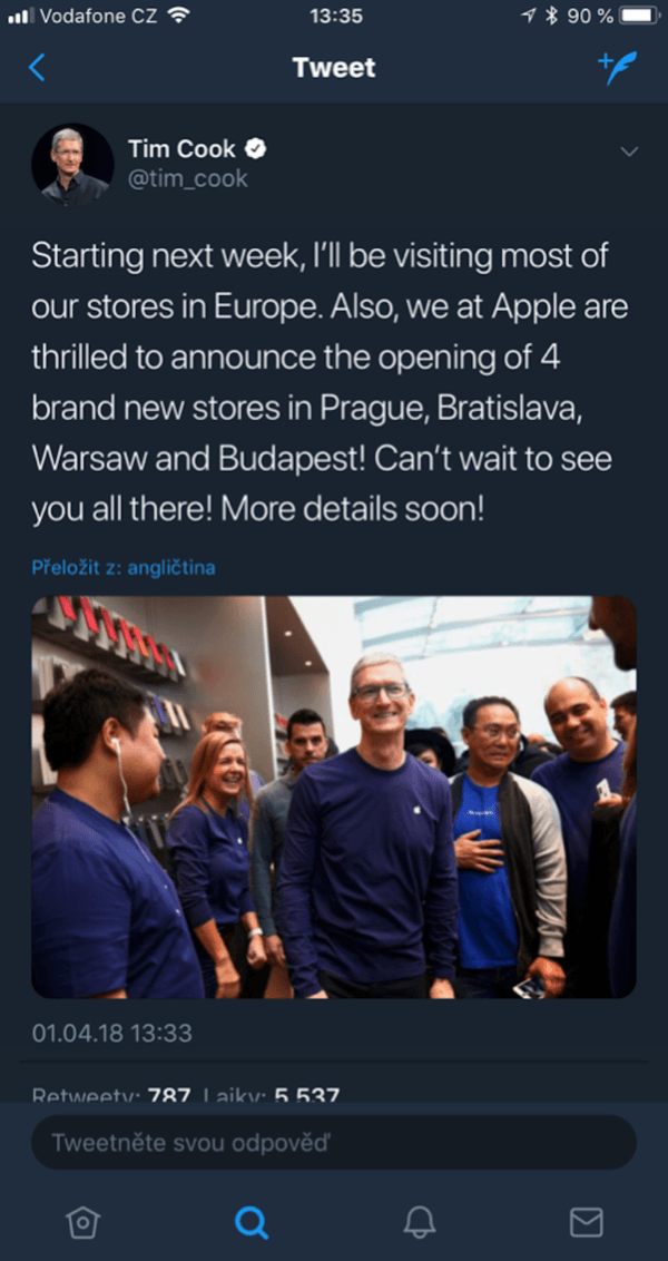Tim Cook se rozhodl, že by si chtěl udělat výlet po Evropě a když už tu bude, tak se rozhodl poctít některé Apple Story svou návštěvou. Vyplývá to z jeho nejnovějšího tweetu. V tom Cook píše, že začátkem příštího týdne se vydává na cestu po Evropě, během které chce navštívit většinu evropských Apple Storů. Nejzajímavější informace pro nás se však nachází zhruba v polovině jeho tweetu. Cook totiž zveřejnil informaci o hned čtyřech nových Apple Storech, které Apple plánuje v Evropě otevřít. A dokonce i jeden v Česku a druhý na Slovensku!