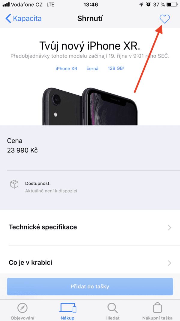 Nejjednoduší a nejrychlejší cesta, jak si něco od Applu objednat, je skrze aplikaci Apple Store, kterou si můžete zdarma stáhnout v App Storu. Jakmile si aplikaci stáhnete, stačí jít do záložky „Nákup“ a zde otevřít kategorii „iPhone“. Poté vyberte, že si chcete nakonfigurovat svůj iPhone XR (druhá položka odshora) a nakonfigurujte si ho podle své libosti (v mém případě černá varianta se 128GB úložištěm).