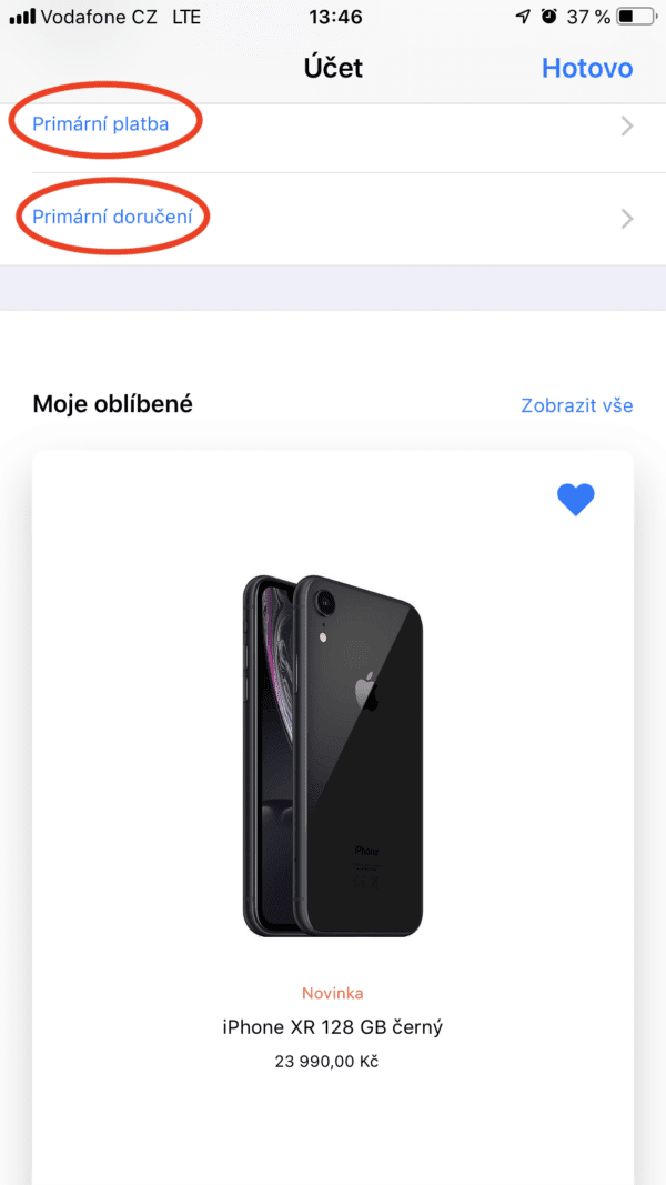 Jakmile budete mít nakonfigurováno, označte tuto konfiguraci stisknutím ikony srdíčka v pravém horním rohu. Tím si tuto konfiguraci uložíte a ušetříte tak čas při spuštění předobjednávek. V tu chvíli totiž jen vyberete svou uloženou konfiguraci a přejdete k placení. Dále se ujistěte, že ve svém účtu máte nastavenou primární doručovací adresu a primární platební metodu. To zkontrolujete tak, že v aplikaci půjdete do záložky „Objevování“ a klepnete na ikonu účtu (v pravém horním rohu). Zde už uvidíte i svou konfiguraci iPhonu XR, kterou jsme vytvořili v předchozích krocích. O něco výše uvidíte však dvě tlačítka s nápisy „Primární platba“ a „Primární doručení“.