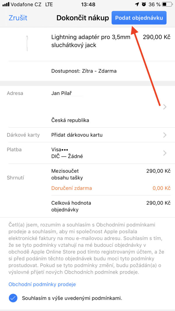 Apple poté ještě naposledy ověří platnost karty tím, že vás požádá o zadání bezpečnostního kódu karty (proto doporučuji mít kartu u sebe) a jakmile stisknete „OK“, bude vaše objednávka odeslána a stačí už jenom počkat na notifikaci o doručení.