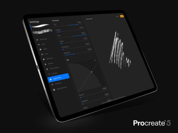 Tieto možnosti máte dostupné v rámci nového Brush Studia, ktoré je teraz podrobnejšie a lepšie. Nechýba ani nový generátor textúr, ktoré môžete využiť pri tvorbe grafiky. Rozšírené možnosti štetcov by sa mali naplno prejaviť pri práci s Apple Pencil, kedy jej prítlak a náklon dokážu generovať stovky rôznych ťahov.