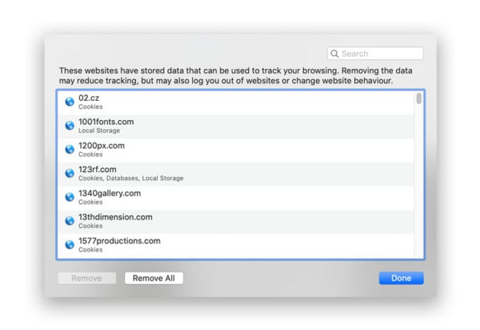 • Následne uvidíte zoznam stránok, ktoré ukladajú cookies a trackery.