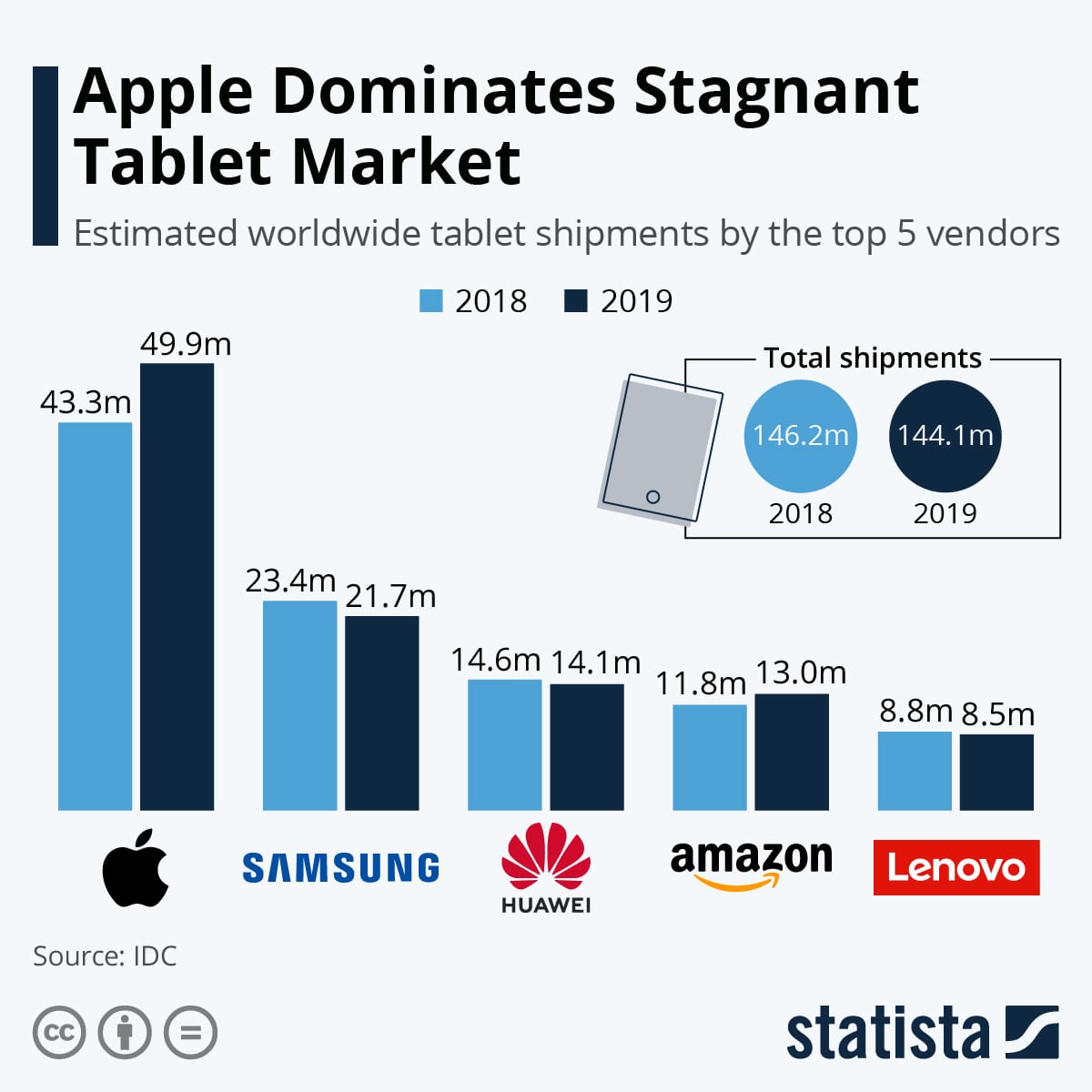 Za uplynulý rok totiž značka predala neuveriteľných takmer 50 miliónov kusov iPadov. Pre porovnanie, druhé miesto patrí Samsungu s 21,7 miliónmi, a tretie Huawei s 14,1 miliónmi kusov. Nasleduje Amazon s rovnými 13 miliónmi a prvú päťku uzatvára Lenovo s 8,5 milióna kusov.