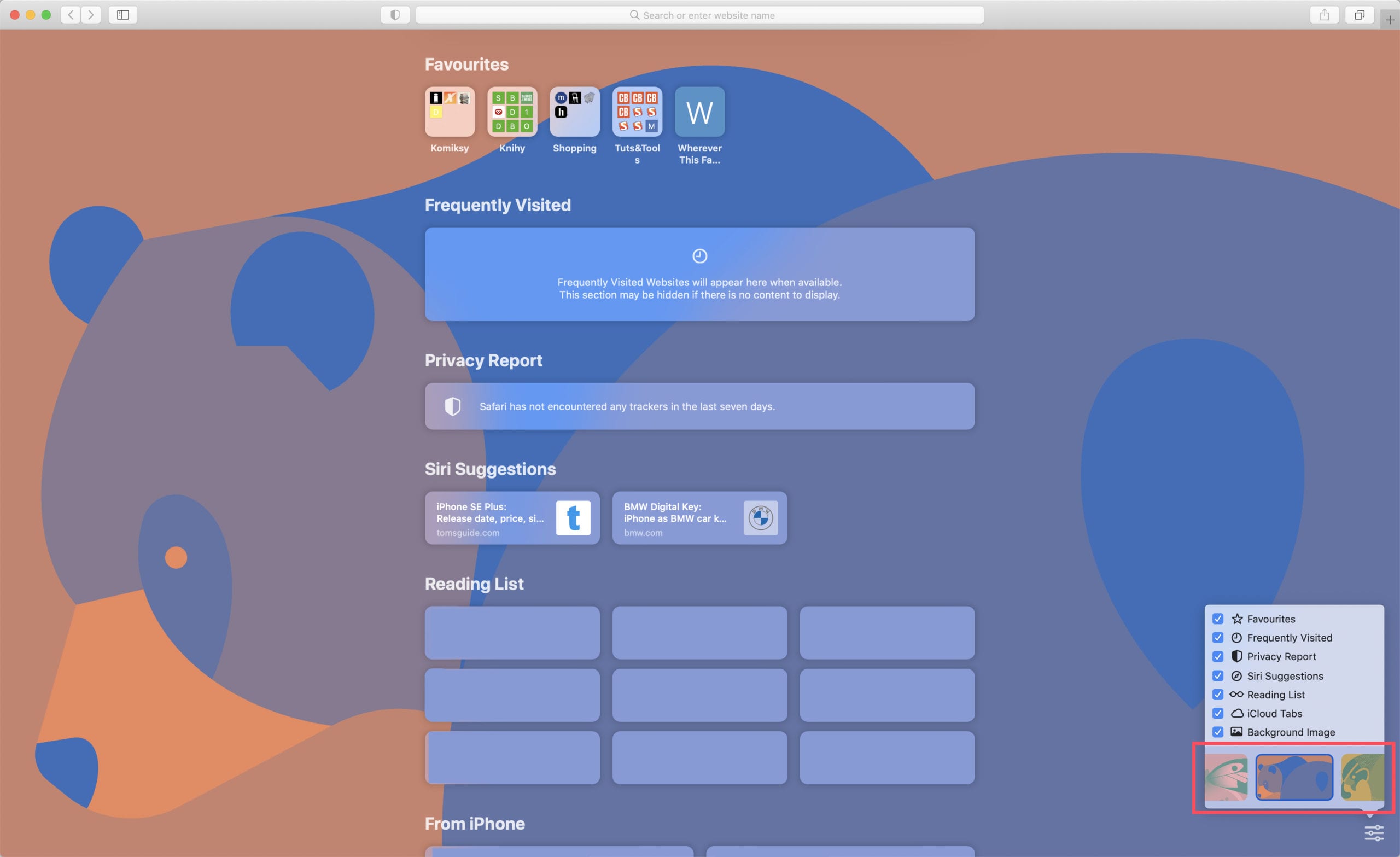 Prispôsobiteľné pozadie poteší tiež, ale ide skôr o milý doplnok. Môžete si zvoliť z dostupných tapiet z macOS, či vlastného obrázku alebo si vybrať z ponúknutých motívov, ktoré Apple pripravil k novému Safari.
