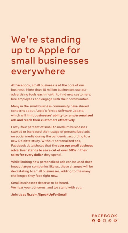 Facebook sa s Apple ťahá za prsty už dlho a priebežne na seba obe strany vzájomne reagujú ohľadom tejto kauzy. Sociálna sieť aktuálne hovorí o dopadoch na malé podniky, ktoré sa v súčasnosti snažia prežiť a na internet bez obmedzení ako komunikačný kanál sa spoliehajú viac ako kedykoľvek predtým.