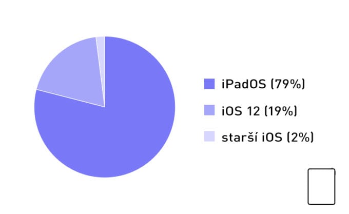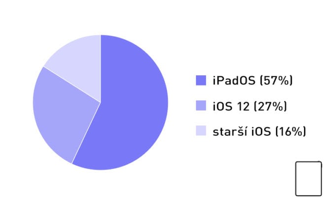 V prípade iPadov za posledné štyri roky vyzerajú čísla nasledovne. Nový iPadOS má 79%, iOS 12 beží na 19% produktov a staršie iOS 2%. Pri zarátaní aj starších modelov je rozdelenie percent menej jednoznačné. iPadOS má nainštalovaný 57% majiteľov, iOS 12 beží na 27% modelov a staršie systémy má až 16% Apple tabletov.