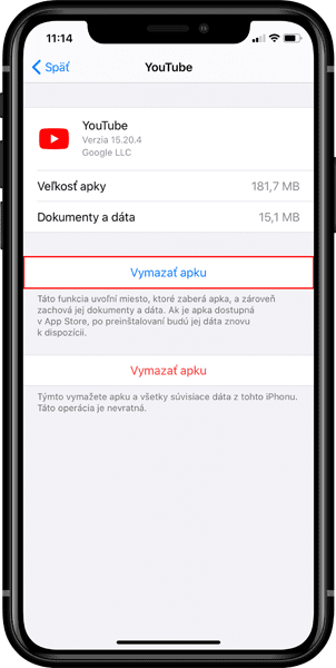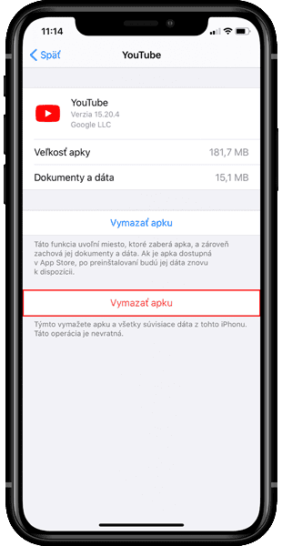 Pod tým je ešte možnosť Vymazať aplikáciu v červenej farbe (Delete App), ktorá apku vymaže aj s dátami.