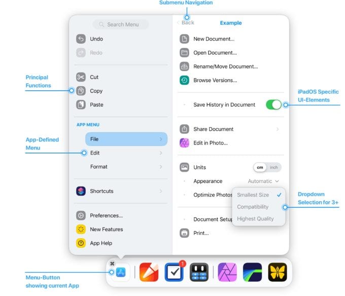 K menu by sa pristupovalo cez ikonku aplikácie v Docku. Funkciu by bolo možné implementovať s podporou pre Split View či vyvolanie menu pomocou gesta. Main menu by zároveň mohlo byť ovládané šípkami klávesnice – presne ako v macOS. Výhodou by zároveň bolo zjednotenie ponuky možností pre rôzne aplikácie.